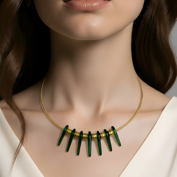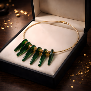 Zeitlose, elegantes Schmuckstück mit grünen Glassteinen.