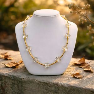 Schlichte Halskette mit einem wunderschönen Glasstein in Rautenform. Diese Halskette schmiegt sich eng an Deinen Hals und verleiht jedem Outfit eine elegante Note.