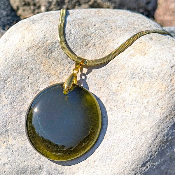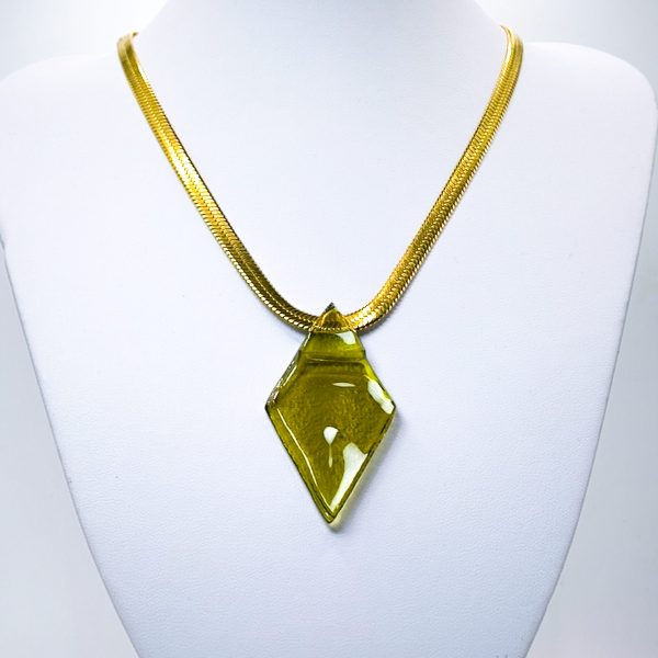 Traumhafte Halskette mit Glaselement in olivgrünem Farbton und Edelstahlkette gold
