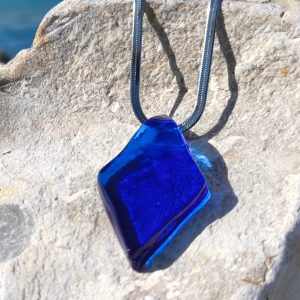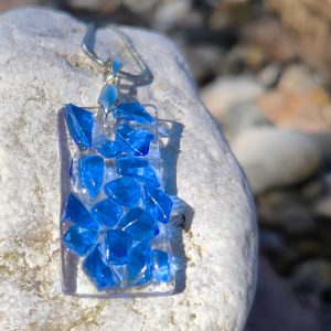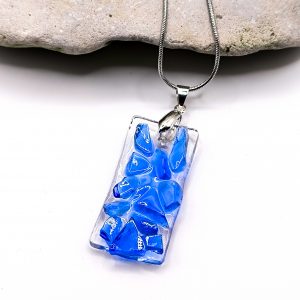 - Traumhafte Halskette mit transparentem Glaselement und blauen Glassplitter, Edelstahlkette silber